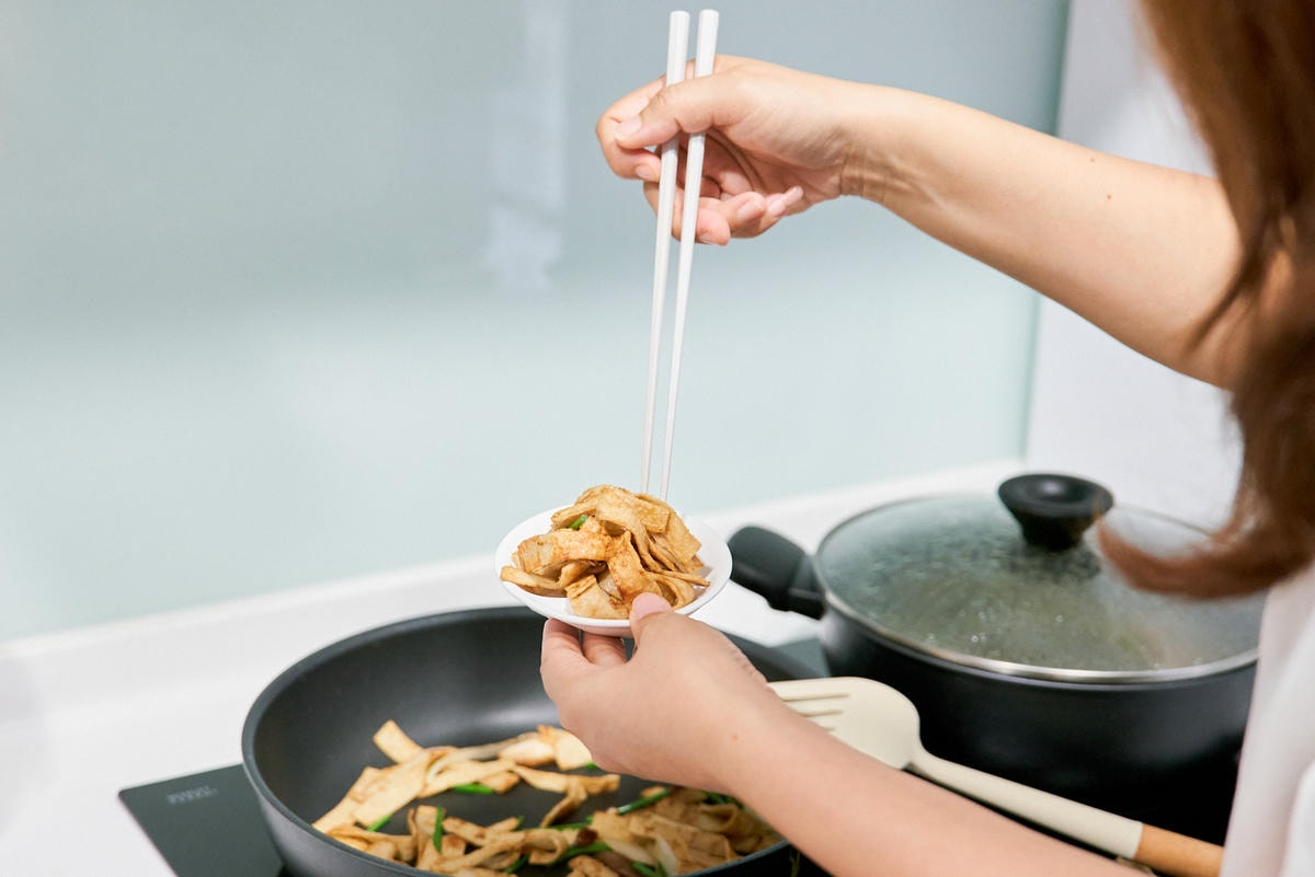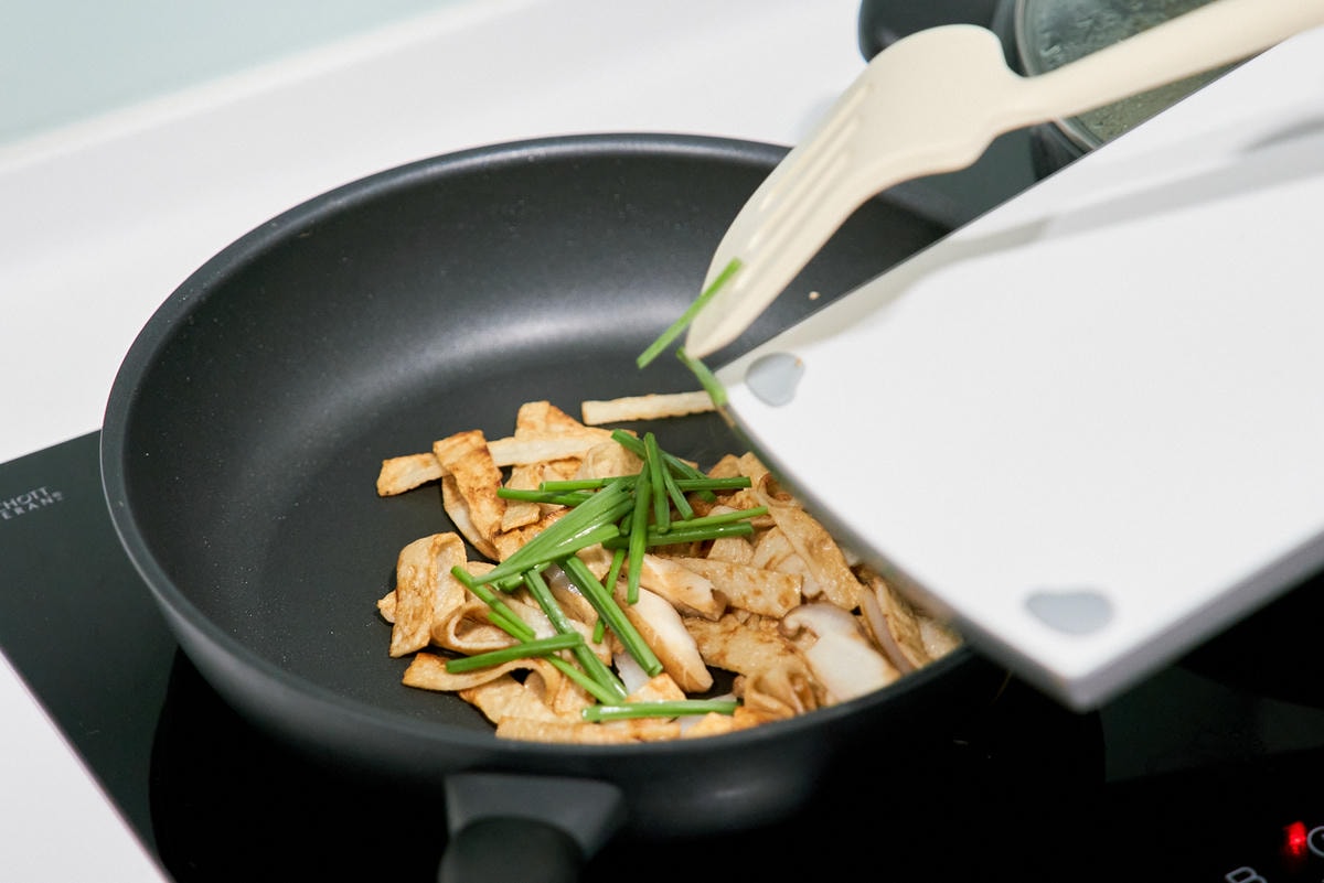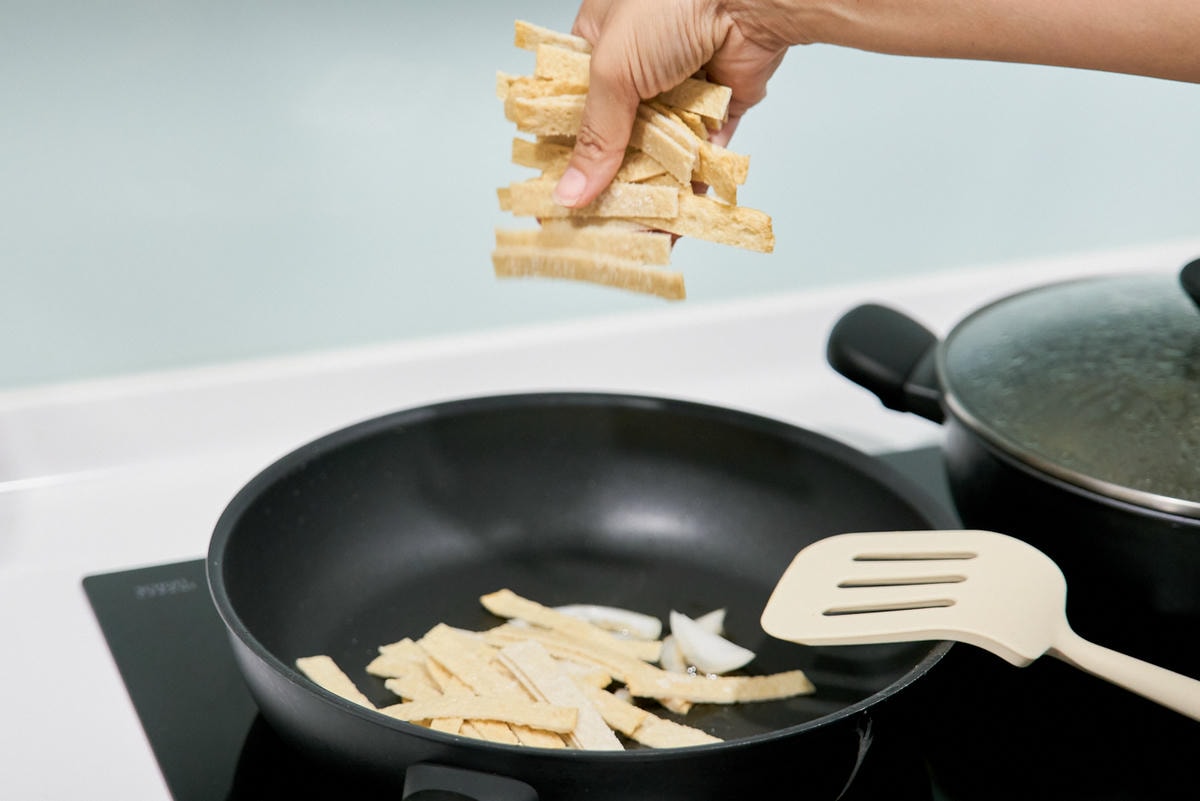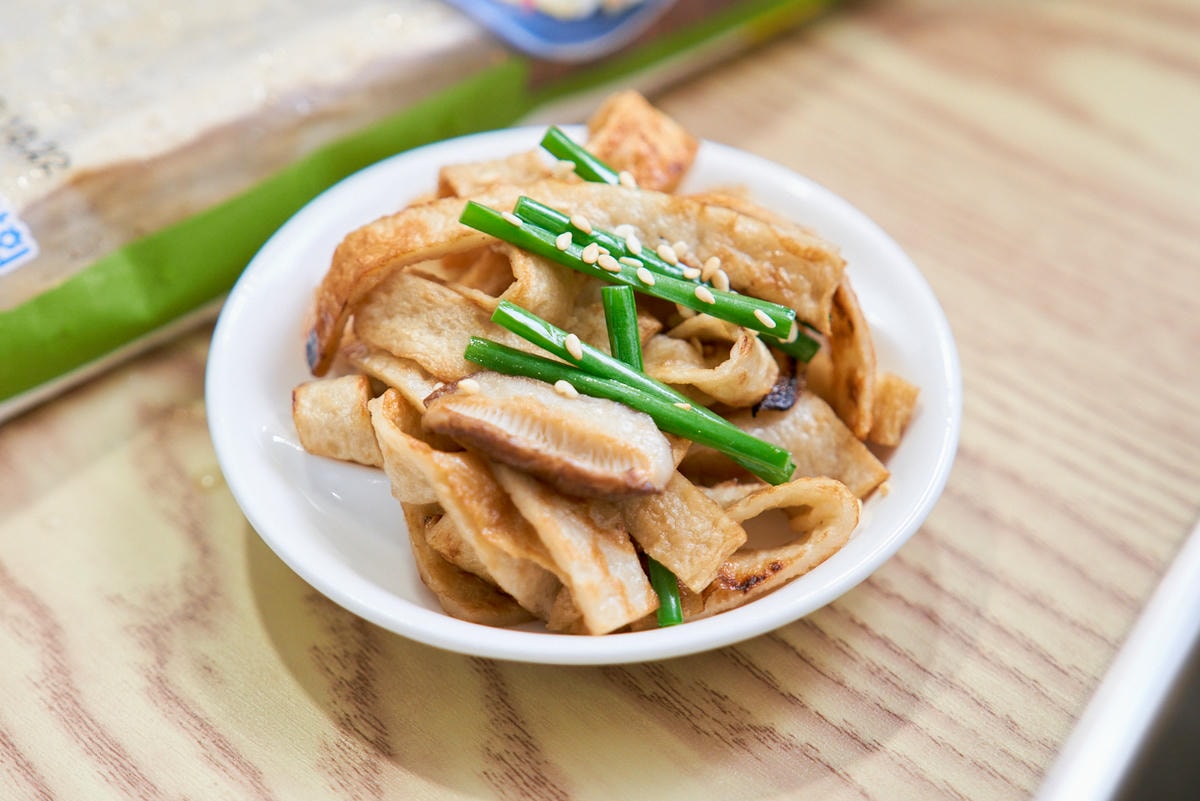 做法完全沒難度!熱鍋後加少許油,先炒香蒜末與蔥末,接著加入韓國水協 傳統四角魚板下去炒,最後淋上醬油與韭菜段跟些許香菇一起翻炒,直到醬汁收乾。就完成超級下飯的韓式定食小菜之一喔!