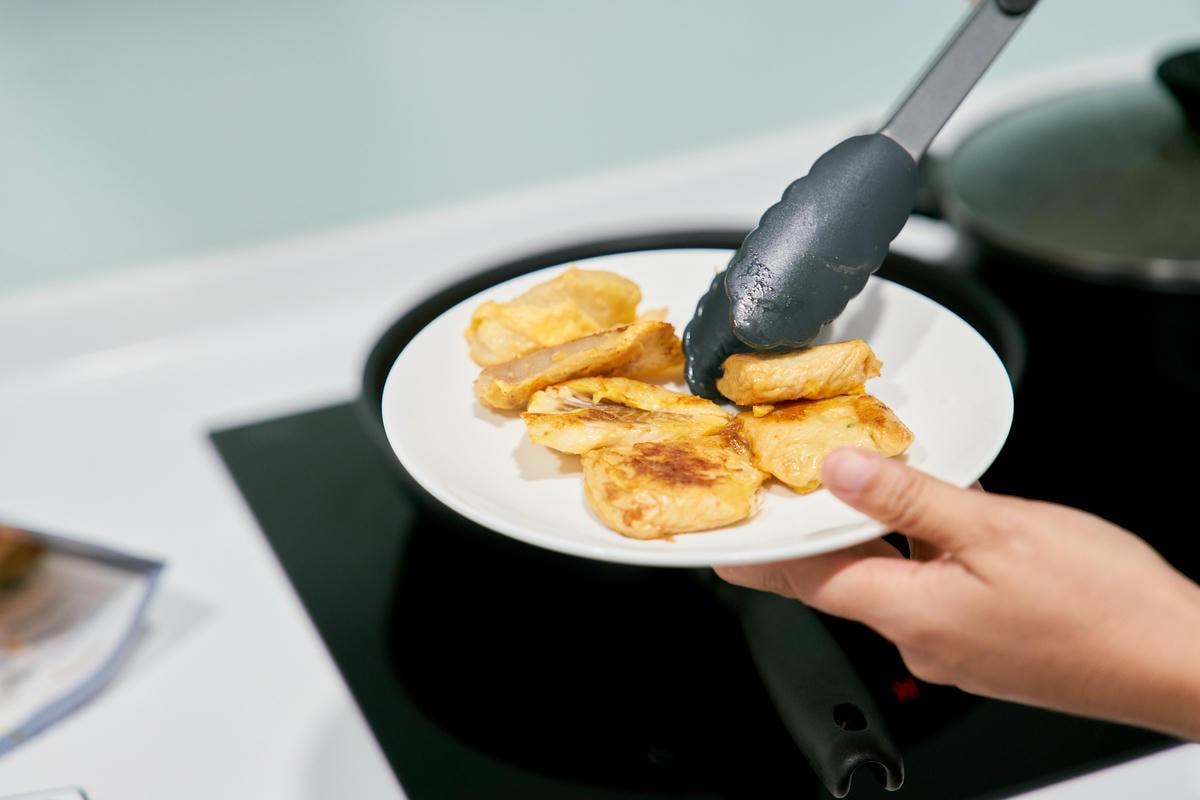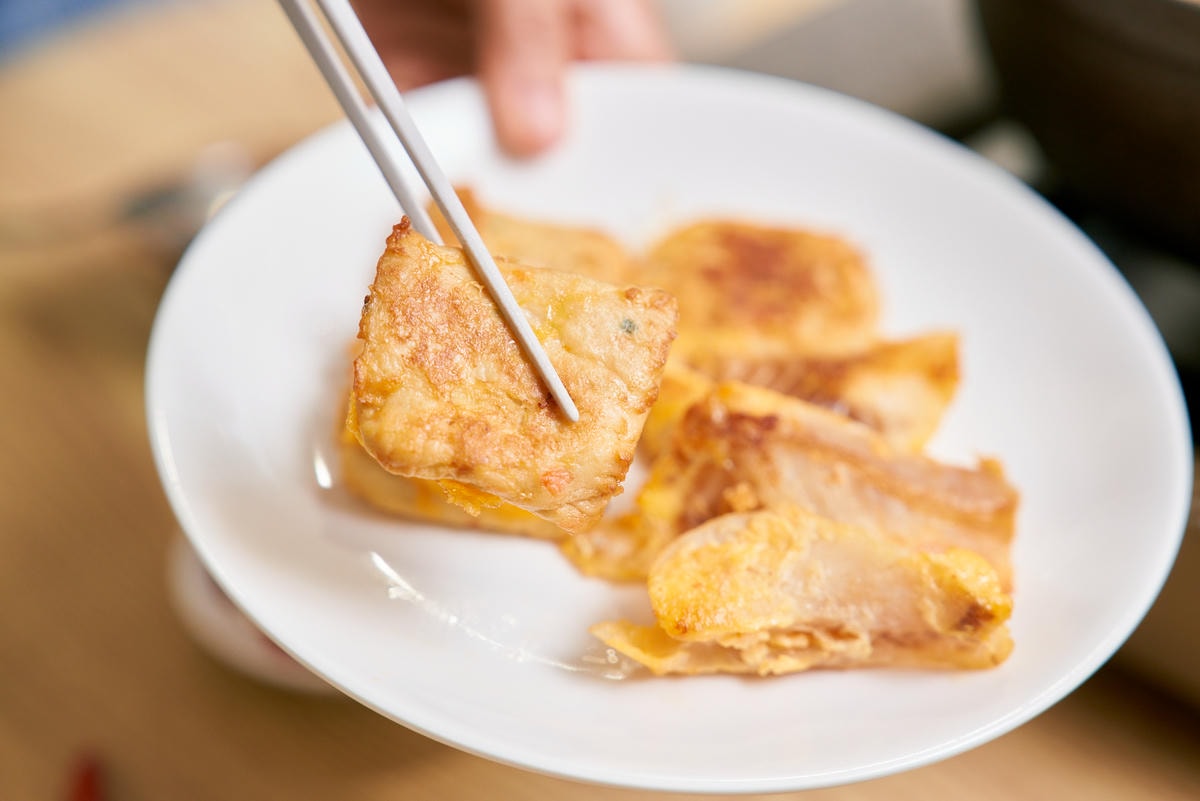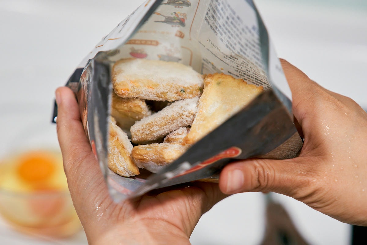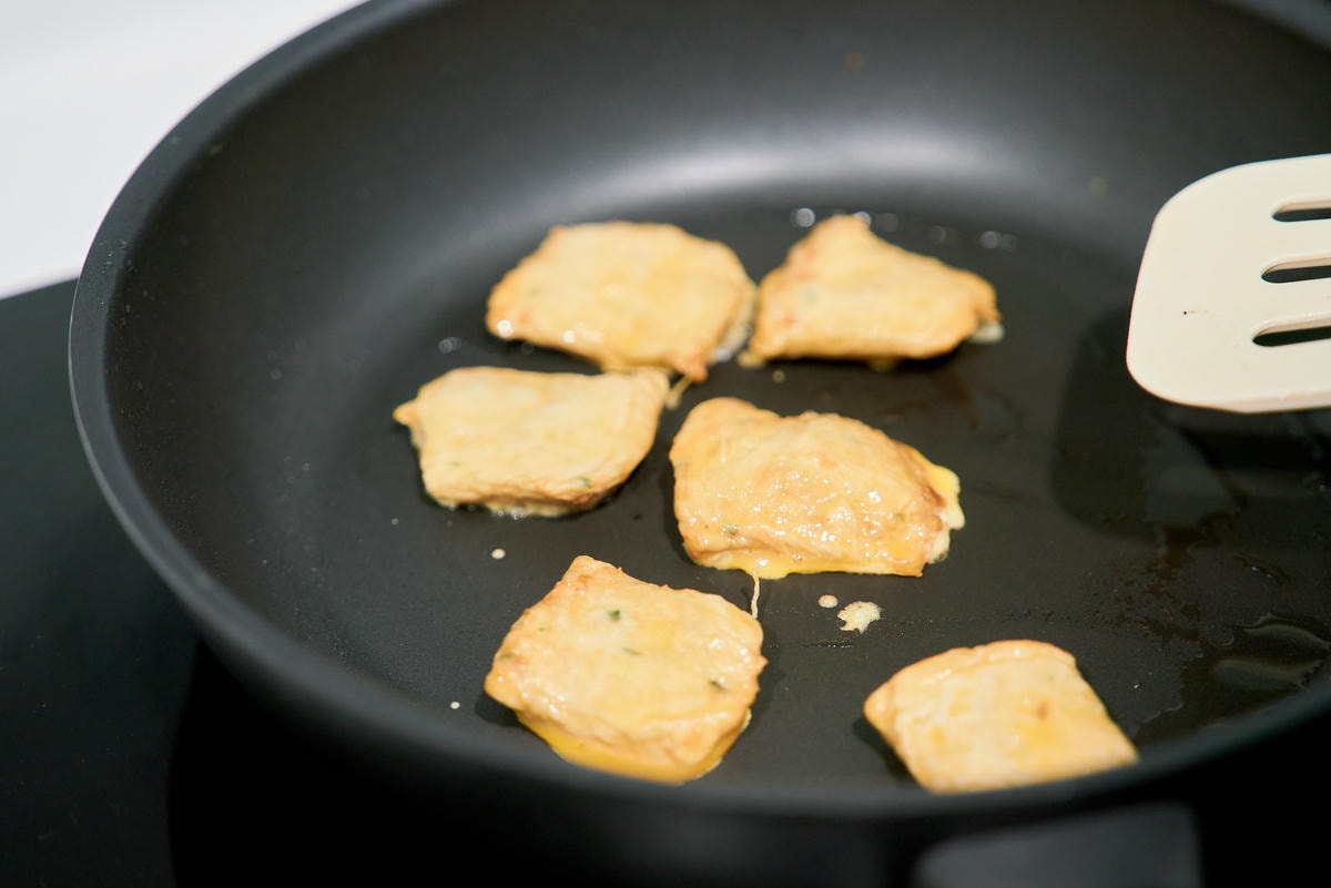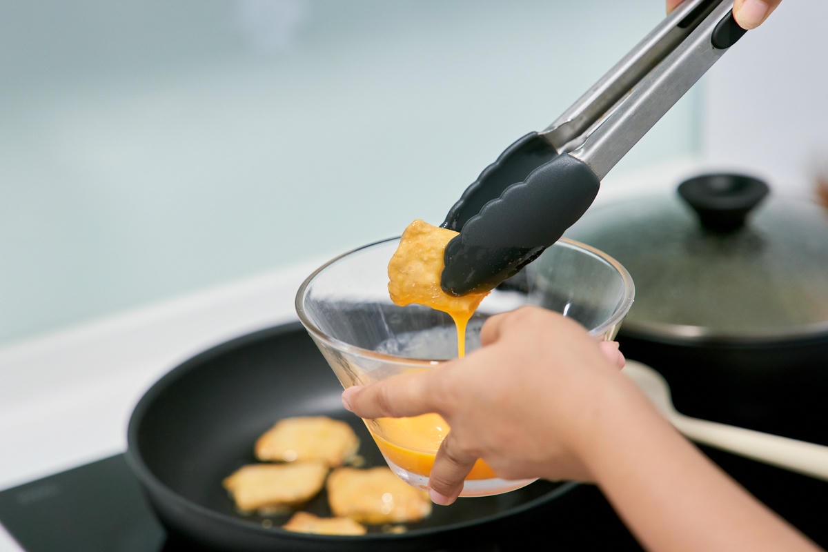 作法超級簡單!平均將表面裹上蛋液,再將魚豆腐煎到表面微微金黃酥脆就可以了!