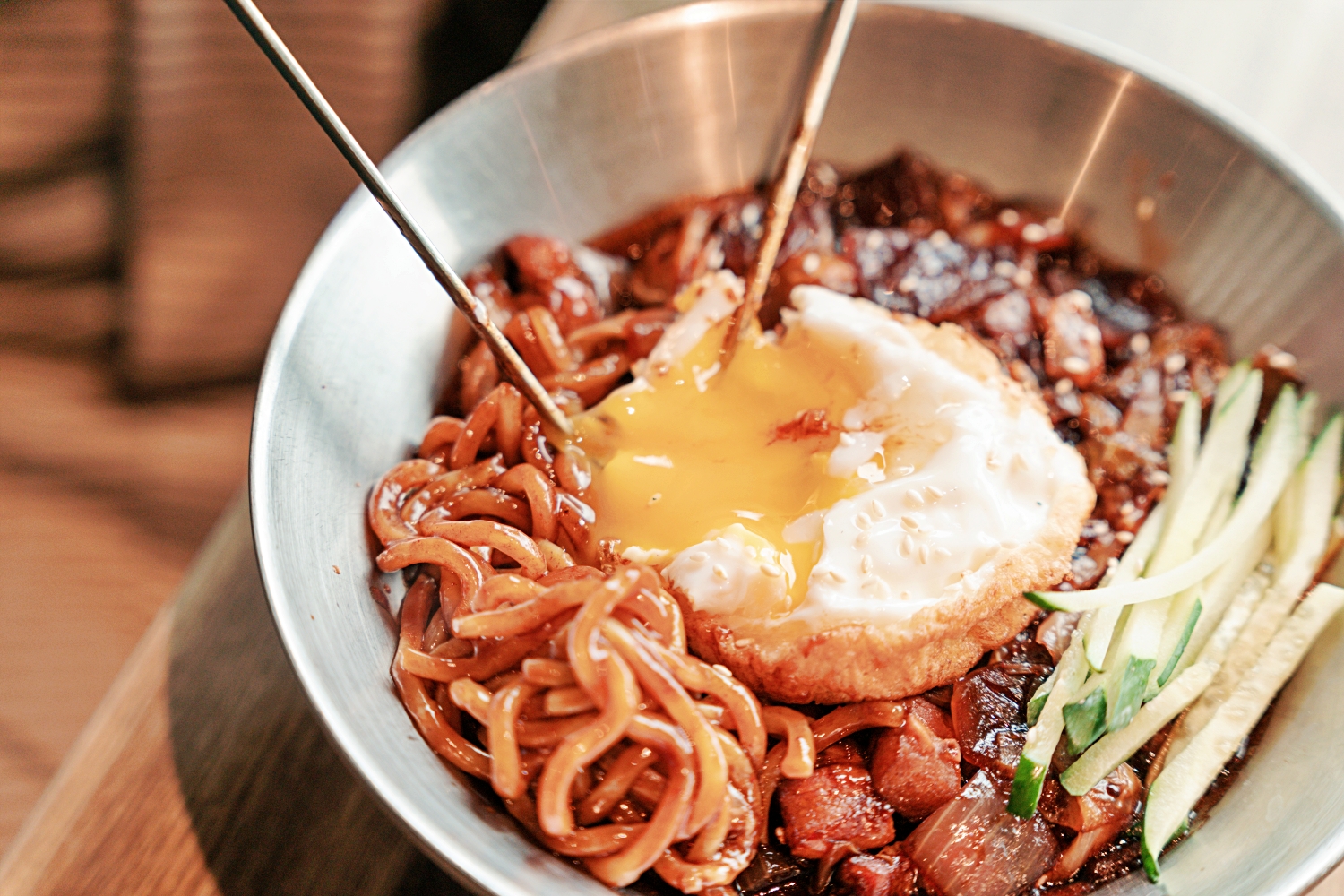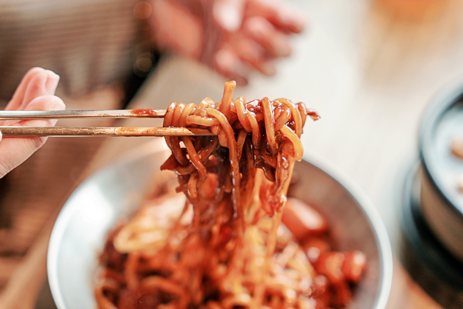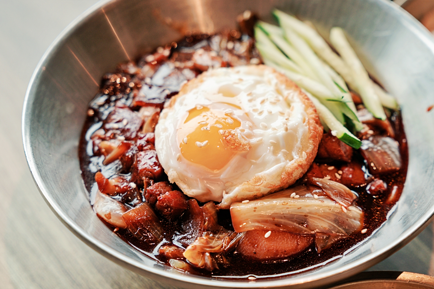 「水赤床韓式烤肉崇德店」的韓式炸醬麵也讓我很驚艷。他們是先把豬肉下鍋爆炒,利用豬油的香氣當第一層基底,接著再加入洋蔥一起拌炒到甜味整個被逼出來,最後才慢慢和黑豆醬融合,整個醬的味道不是單純的鹹,而是有層次、有厚度、越吃越香的那種。炒完的醬和麵條拌在一起時,就能聞到那種濃濃的黑醬香氣,可是吃起來卻完全不會死鹹,反而是洋蔥的自然甜味把整體味道撐得更圓、更滑順。