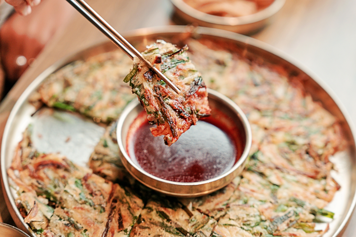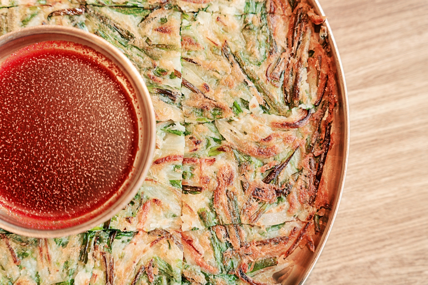 台灣許多韓式煎餅都失去韓國煎餅薄脆的最大特色!所以我很愛在「水赤床韓式烤肉崇德店」點這道料理!真正邊邊是那種金黃微脆的狀態且超薄!但裡面卻保留韭菜本身的水分與鮮味,完全不會乾乾的。沾上一點韓式辣椒粉與醬油調製的醬汁,會讓人不知不覺一口接一口!超好吃!